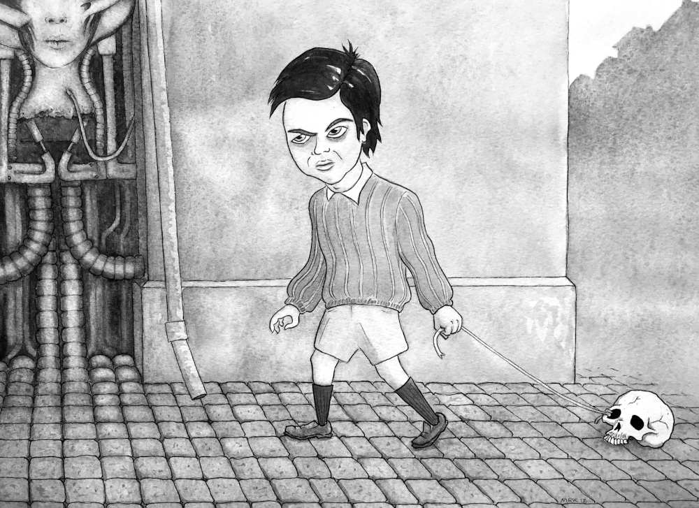 Yeah, you got it! I was inspired by this H.R. Giger documentary in which they told a story from his childhood when his father gave him a human skull as a present and it terrified him. Conquering his fear involved tying a string to it and walking it around in the street.