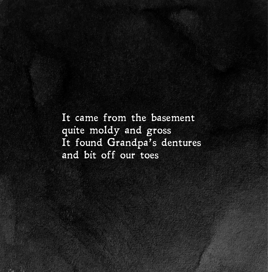 It Came from the Basement is an illustrated, inky homage to monsters and monster movies, accompanied by a collection of ridiculous rhymes to make you laugh uncomfortably in the night.