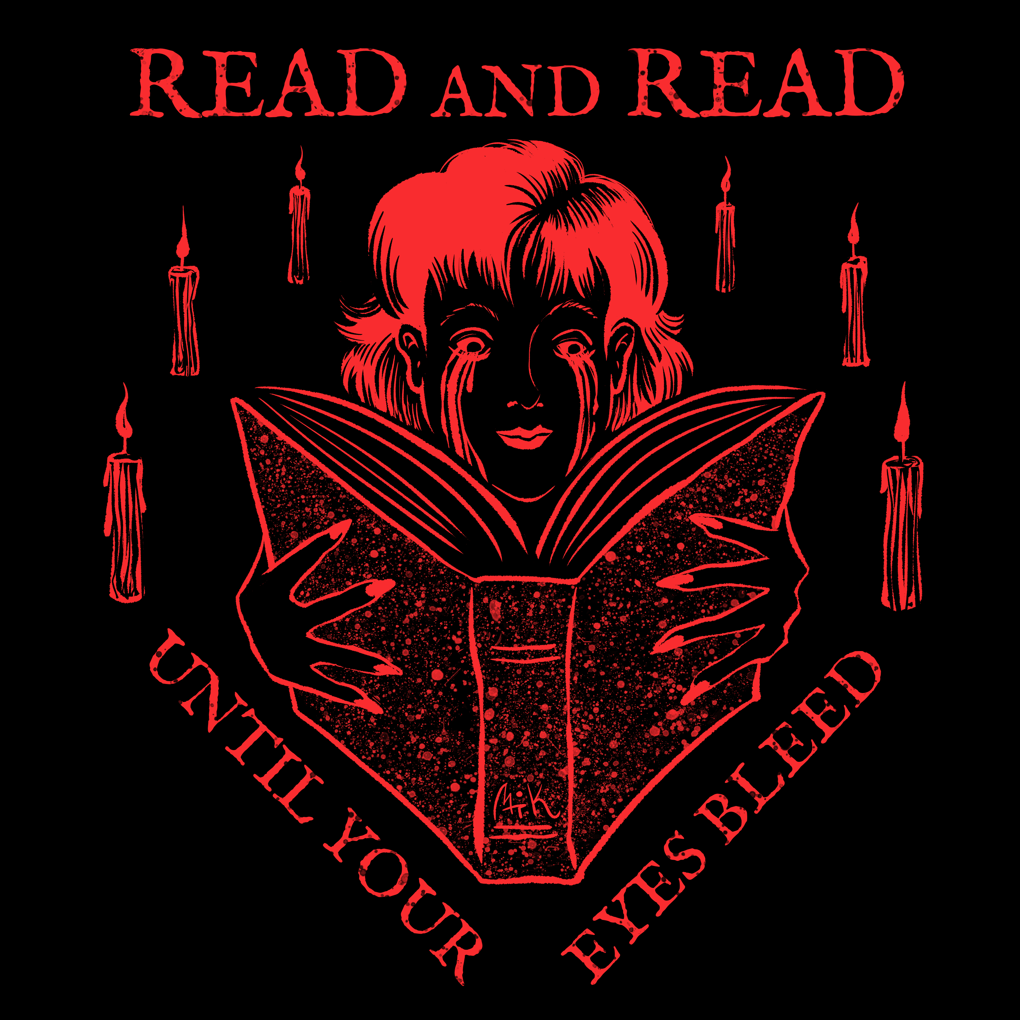 READ AND READ UNTIL YOUR EYES BLEED is a design that was inspired recently by a book that I just couldn’t put down. You know the feeling, right? Not blinking enough, eyes drying out, but you just need to get to the end of the chapter!
